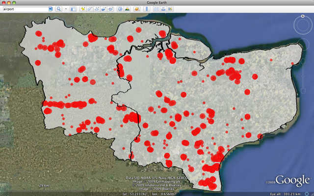 Posted: 06 Aug 2009 Just for fun, here is a map illustrating occupied gcn ponds for Kent. Larger circles this time represent 1 km radii and indicate waterbodies that have another gcn record (any record, not just occupied pond) within 1 km. Small circles represent more isolated records and are drawn with a radius of 500 m.