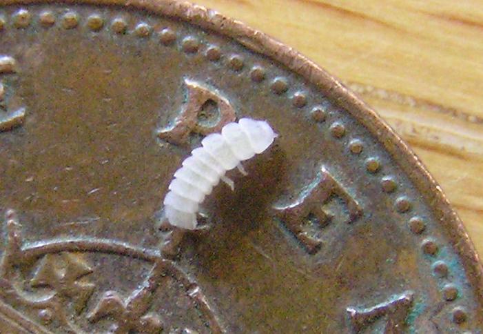 Heres is a white larva - just hatched (above) placed on a penny Here is a normal coloured larva - placed on a 5pence piece