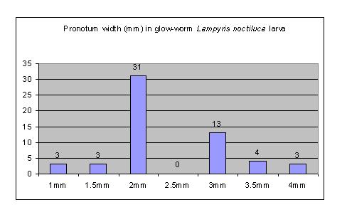 Posted: 15 Mar 2006 Here are some pronotum measurements from a population of glowworms in Berkshire. The 20 larva which measure over 3mm (width of pronotum) are more likely to be female while the 2mm are possibly males or larva in their second year - the 1 to 1.5mm are in their first year. These were all relocated from a works area last year into adjacent habitat - all larva were found under roofing felt tiles