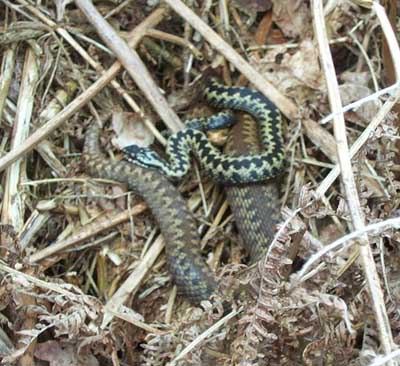 Posted: 30 Apr 2004 Hi Tony, Plenty of berus mating activity at Hindhead on the 27th, numerous matings observed total of 18 adder, 12 male, 6 female. Males were very prominent whilst mate searching in the bracken. I took your advice from last year and watched and waited when I found females lying out, this gave a high count for my 'difficult' bracken site, as males came in from all directions as I sat and watched. Certainly a 'good adder day' in my book! Also observed a male combat close in for the first time. Just a note, the male combat occured immediately after the larger male had mated with the female below. She moved off rapidly with the mating male in persuit, only for him to reappear from the bracken in combat with a smaller male. The picture is of the same pair mating an hour or so later. The smaller male approached the pair again during the mating process but quickly made his way off.