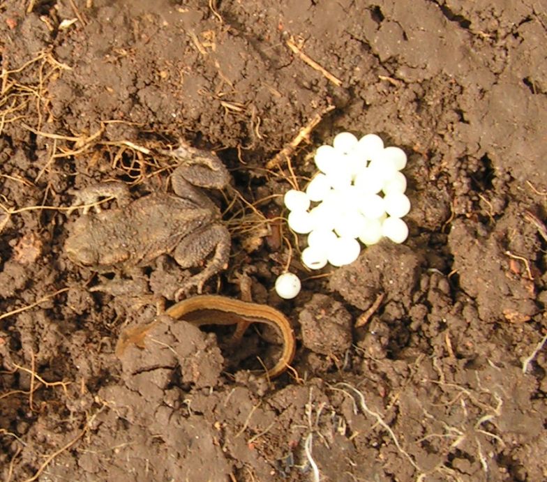 Posted: 07 Sep 2007 Hi Phil, Female smooth newt triturus vulgaris, and a juvenile common toad bufo bufo. The eggs are not related to either of the amphibians, they're mollusc eggs - slugs at a guess. |