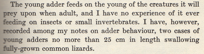 Posted: 05 Aug 2008 Juvenile adders exist mainly on common lizards. Common lizards give birth some time before adders and at the time of adder birth the lizards are almost double their size; ideal prey for the juv adders. Interestingly, at Cors Caron, the juv adders prey on common lizards and the adults mainly on frogs. Some juv adders I have recorded taking adult common lizards, they look like a pork sausage can't even bend their body. 'I get my kicks on Route 62' |