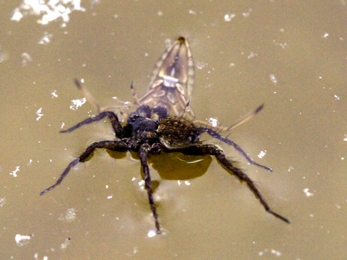 Posted: 04 Jun 2006 Another one I'm afraid. Watched an interesting fight between what I think maybe a Pardosa pullata, and a pack of water boatmen, between one and four at any time. Interestingly, the spider easily fought off the attacks, and made it to dry land. Only to then walk back across the water !
