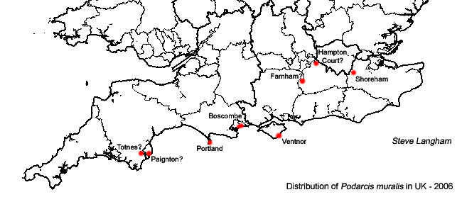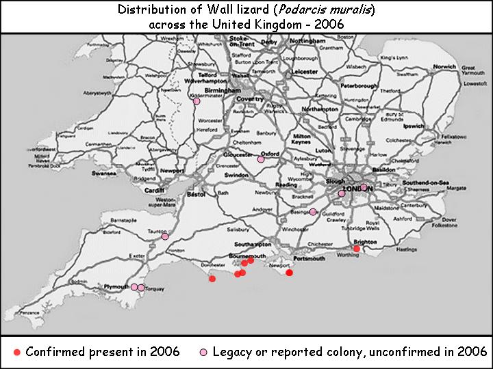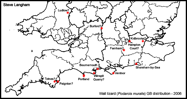 It may be worth looking at this article - Quayle A & Noble M (2000) The Wall Lizard in England British Wildlife Vol12 No 2 December The Shoreham population is on the coast in Sussex - I think are still there - J Baker photographed their habitat - garden walls etc London - Kidbrooke, Shropshire - Ludlow & South West Hampshire (New Forest) are all mentioned. Regards