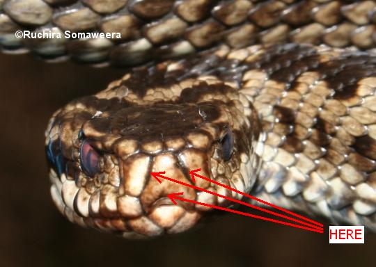 The rostral is the scale pointed out by the arrow in the piccie above. The idea is that the rostral is strongly marked in black in males, and more uniform in females. In view of the adder shown in my previous post, I am not so convinced. Cheers, Wolfgang Wolfgang Wüster School of Biological Sciences, University of Wales, Bangor http://sbsweb.bangor.ac.uk/~bss166/ |